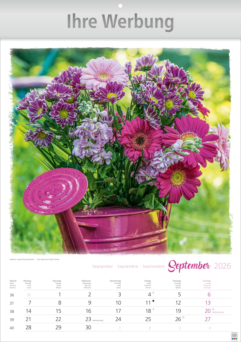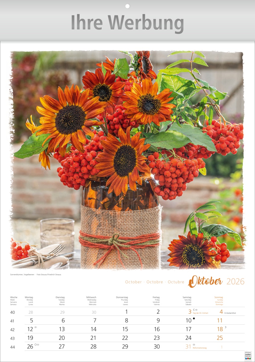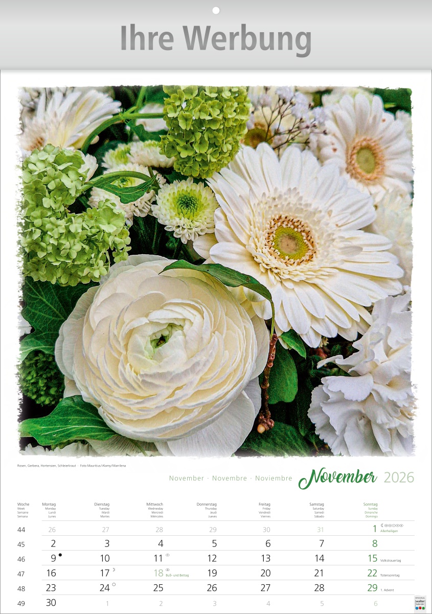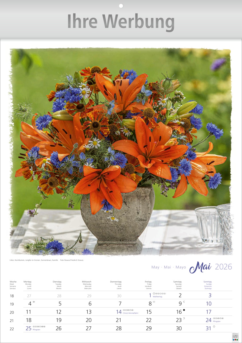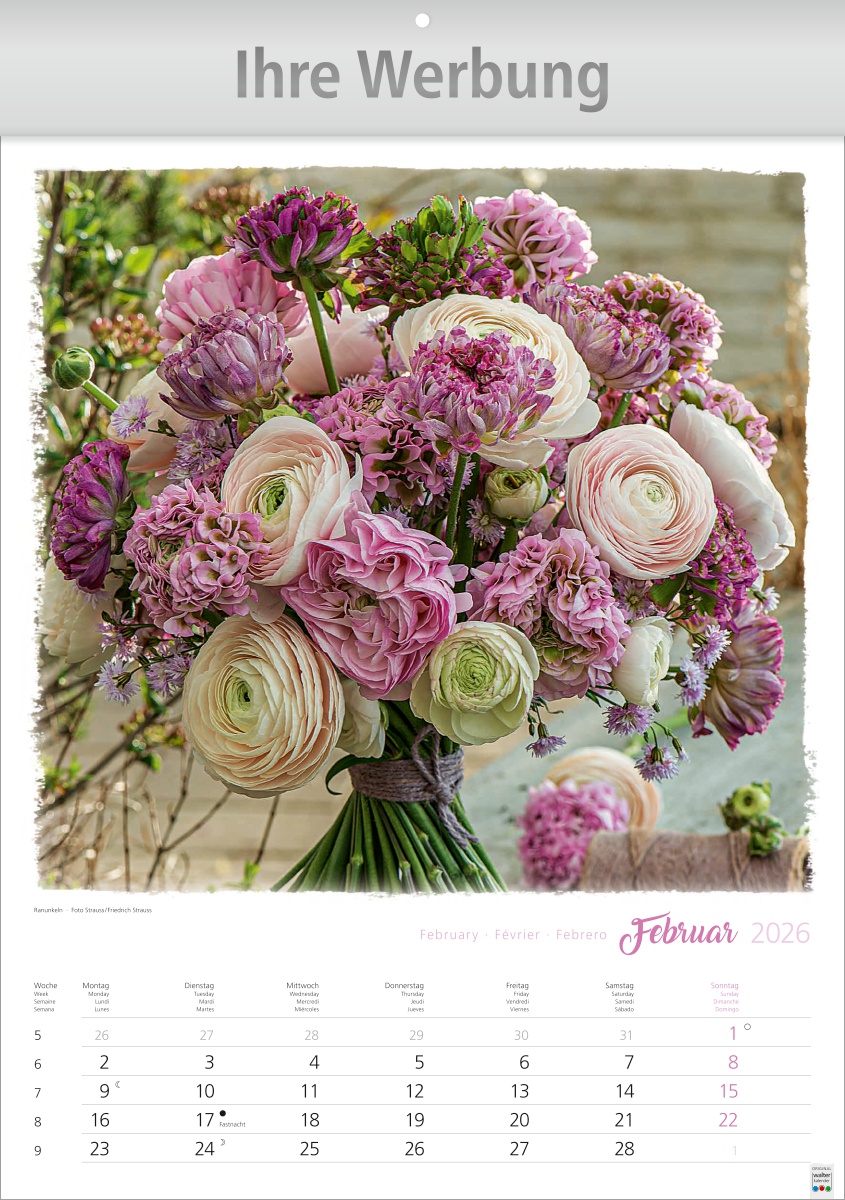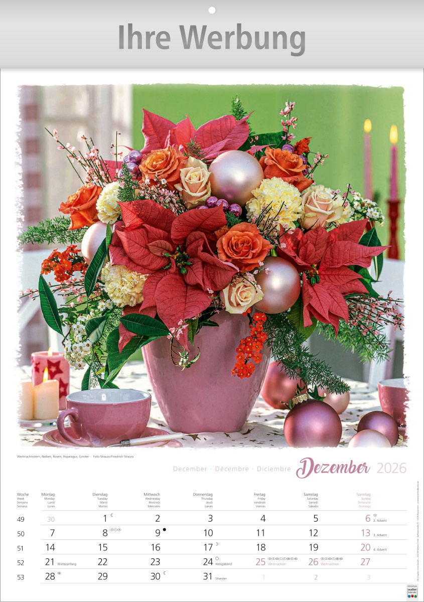 Blumensträuße in wunderschönen Farben und Arrangements, Natur und Schönheit das ganze Jahr genießen - im Mittelformat und 4sprachig. Werbefläche auf Falzl: 300 x 50 mm