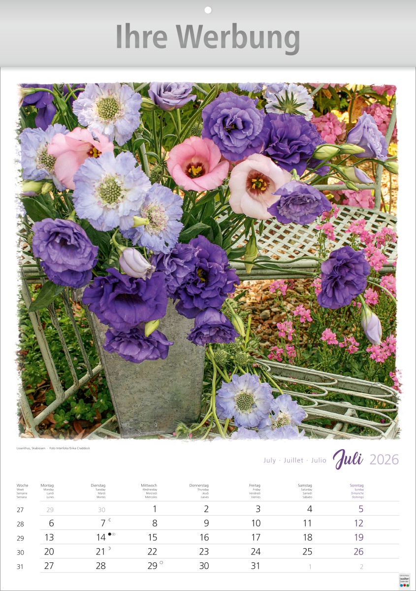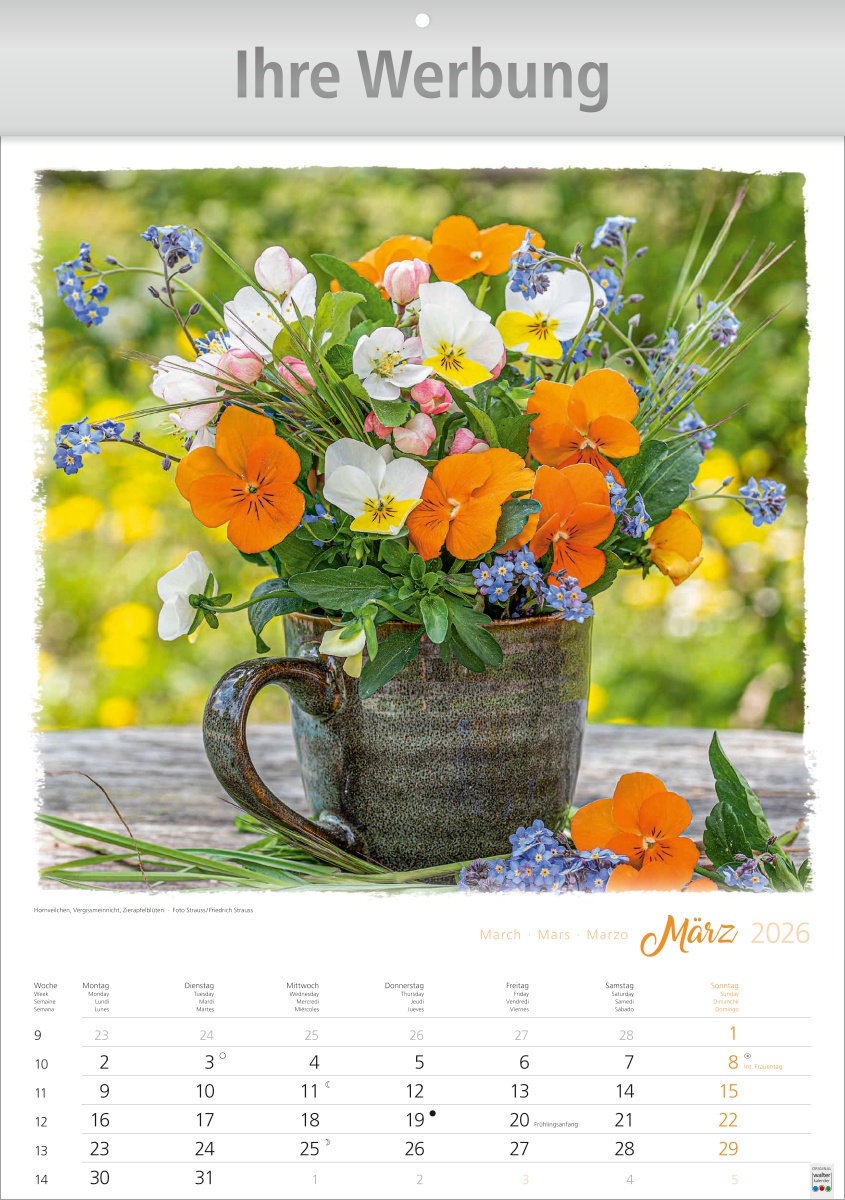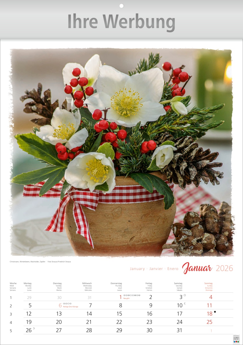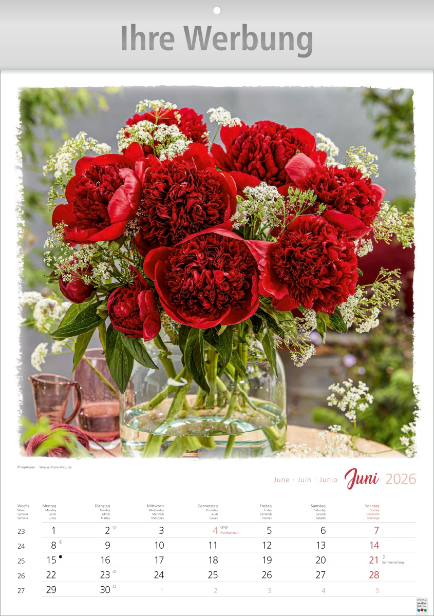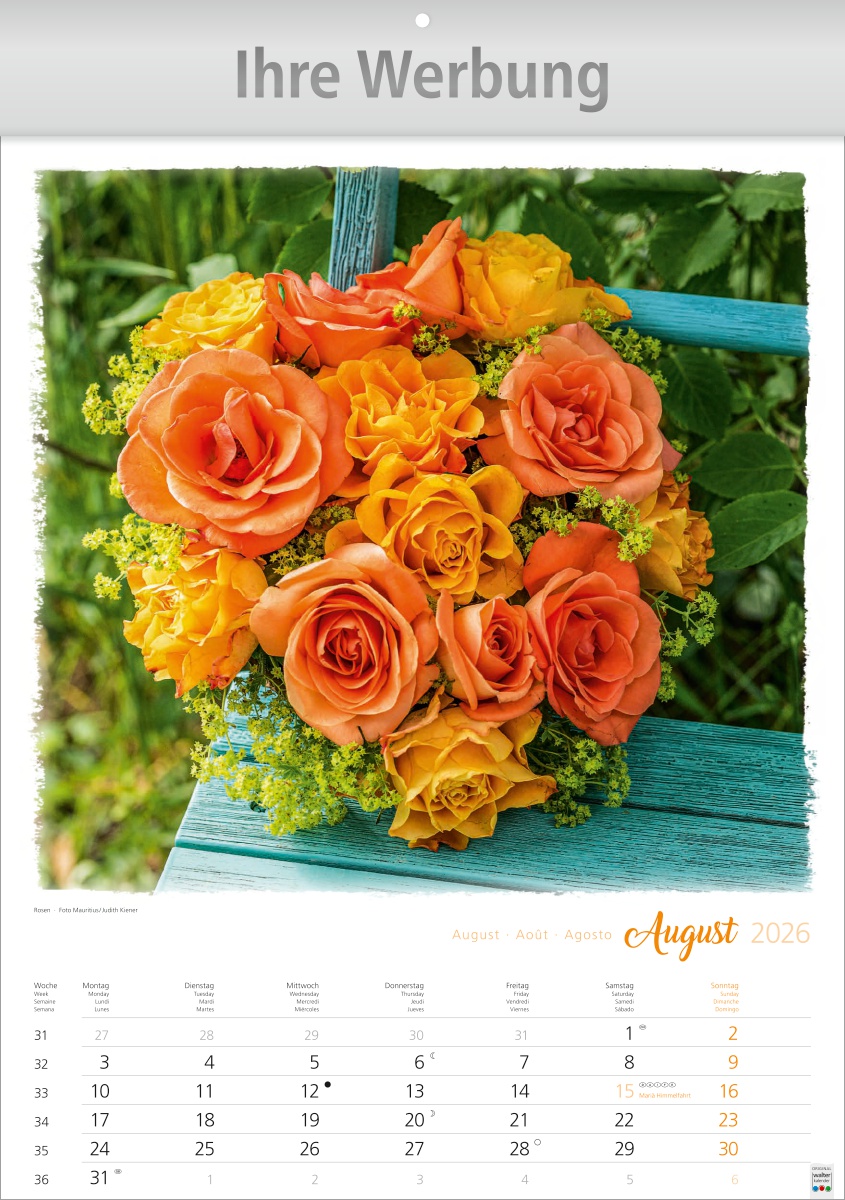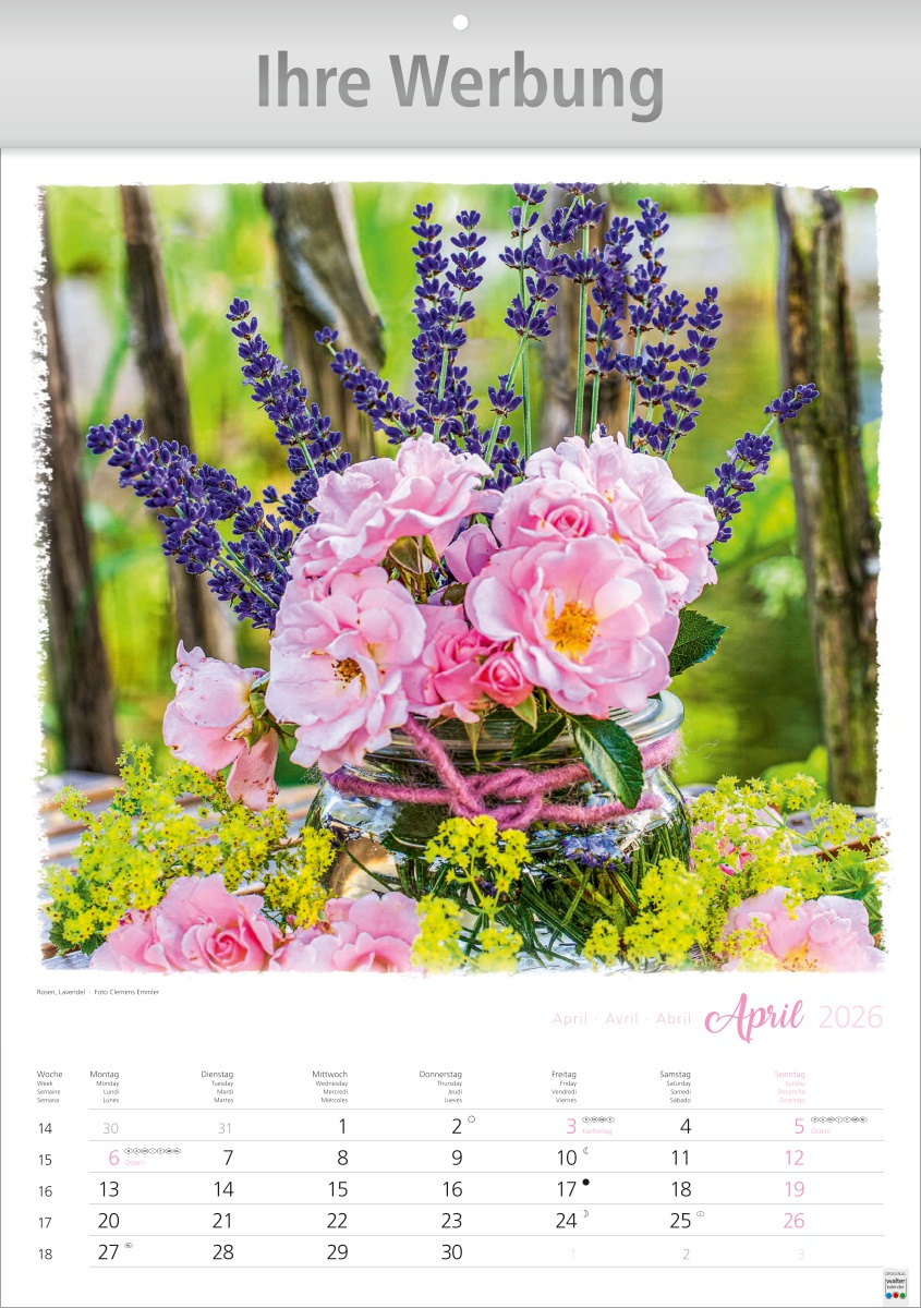 Blumensträuße in wunderschönen Farben und Arrangements, Natur und Schönheit das ganze Jahr genießen - im Mittelformat und 4sprachig. Werbefläche auf Falzl: 300 x 50 mm